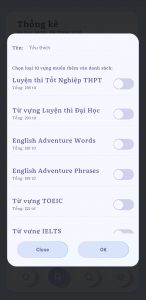 - Trong trang danh sách, bạn sẽ thấy số lượng từ vựng đã hiển thị và đã học thuộc, bạn cũng có thể tự tạo danh sách của riêng mình từ đây