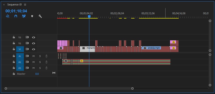 Ở trên là một Sequence (các video được sắp xếp tuần tự theo dòng thời gian) của Premiere. Dòng V1 mình để video chạy tuần tự, dòng V2 là các chữ, hình ảnh sẽ chạy ra. A1 là các hiệu ứng chạy ra chạy vào, A2 là nhạc nền video… Dòng thời gian chạy đến đâu thì chỗ đó được hiện ra trên video.