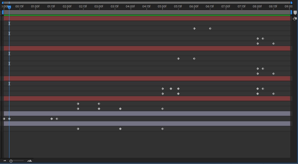 Ở trên là dòng thời gian của After Effects. Bạn có thể thấy, với 6 Layer (là các dòng kẻ đỏ, tím) và 1 ít hiệu ứng (là các Key frame) nhưng nhìn trông đã khá rắc rối. Như ở hình trên, các Layer tồn tại từ đầu đến cuối video. Nó được quy định bởi các key frame khi nào xuất hiện, khi nào biến mất…